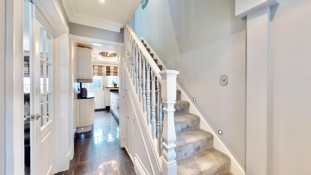 Via Double glazed Composite door ,granite/quartz flooring , flat plastered walls to ceiling with spot lights and mirror radiator housing storage cupboard and under the stairs cupboards.