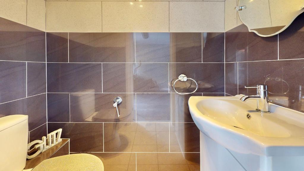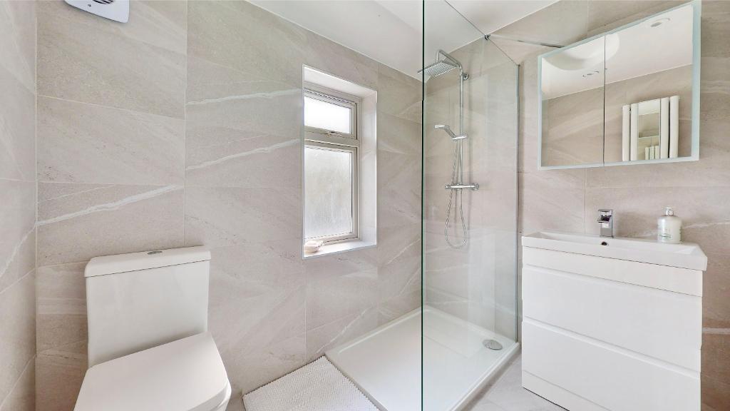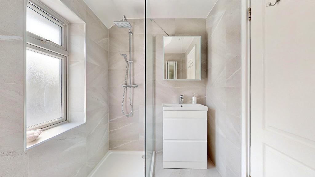 7' 4'' x 5' 6'' (2.25m x 1.68m) 3 Piece suite comprising of a low level w/c , Wash basin set within built in vanity unit, walk in shower with floor to ceiling glass doors and tiled walls and ceiling.