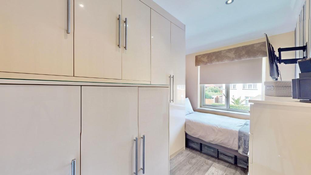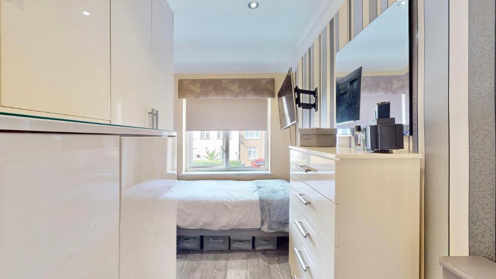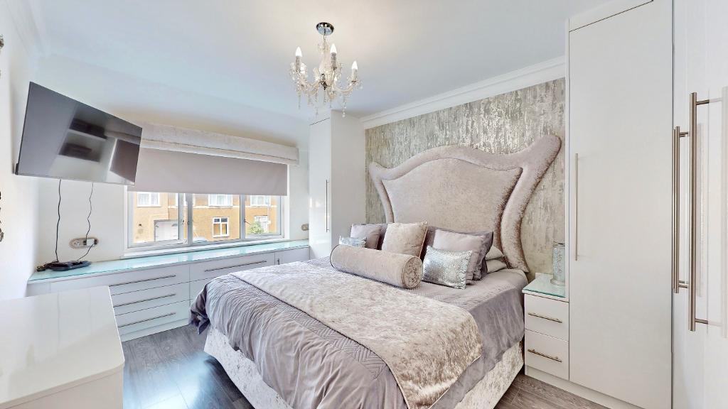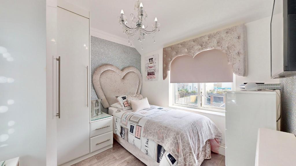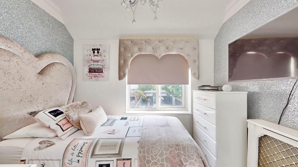 9' 2'' x 8' 10'' (2.81m x 2.71m) Flat plastered walls to ceiling with silver glitter feature walls. Wooden floor, radiator with built in gloss wardrobes. UPVC window to front.