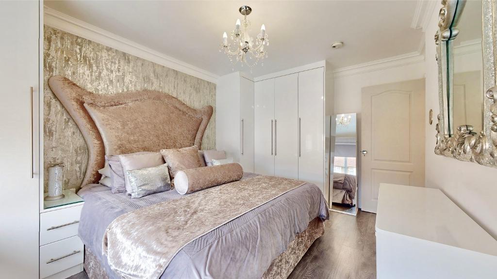 20' 2'' x 14' 3'' (6.18m x 4.35m) Flat plastered walls to ceiling with a feature wall. Gloss built in wardrobes and cupboards and wooden flooring. UPVC window to front aspect.
