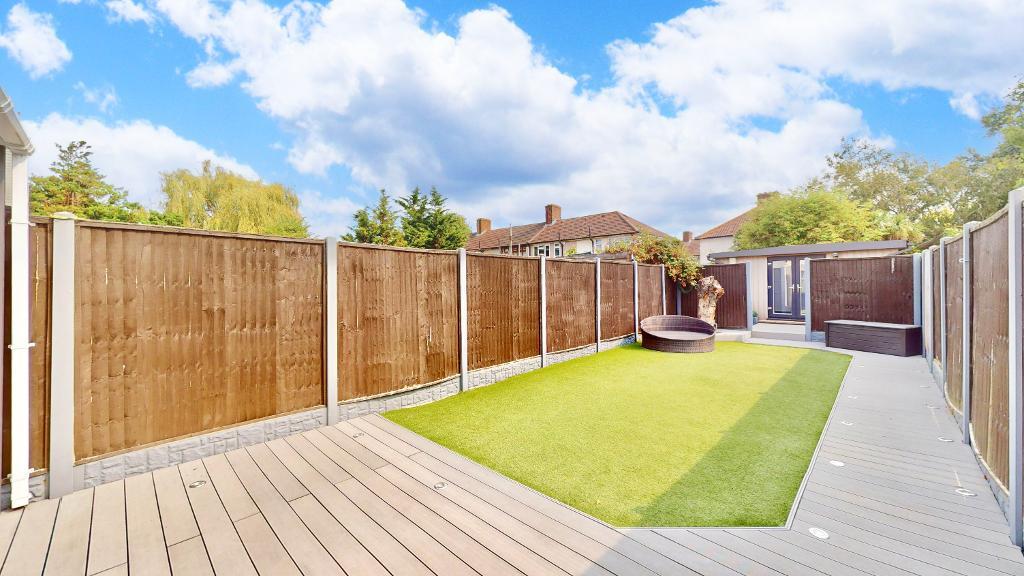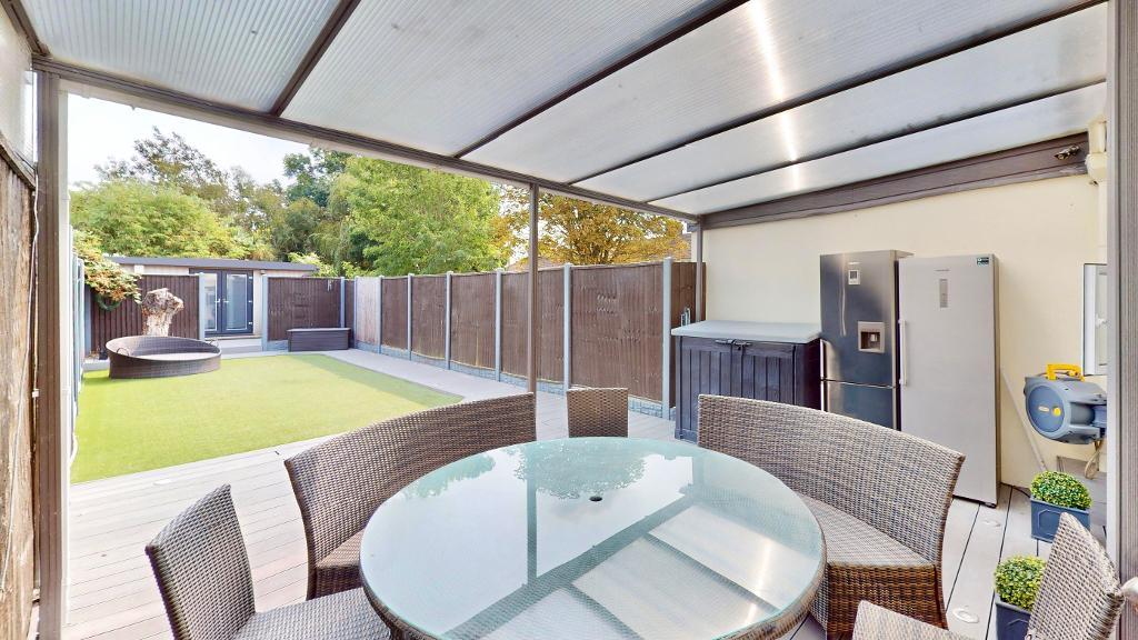 95ft Garden with decking patio and landscaped garden leading to a fantastic spacious summerhouse.