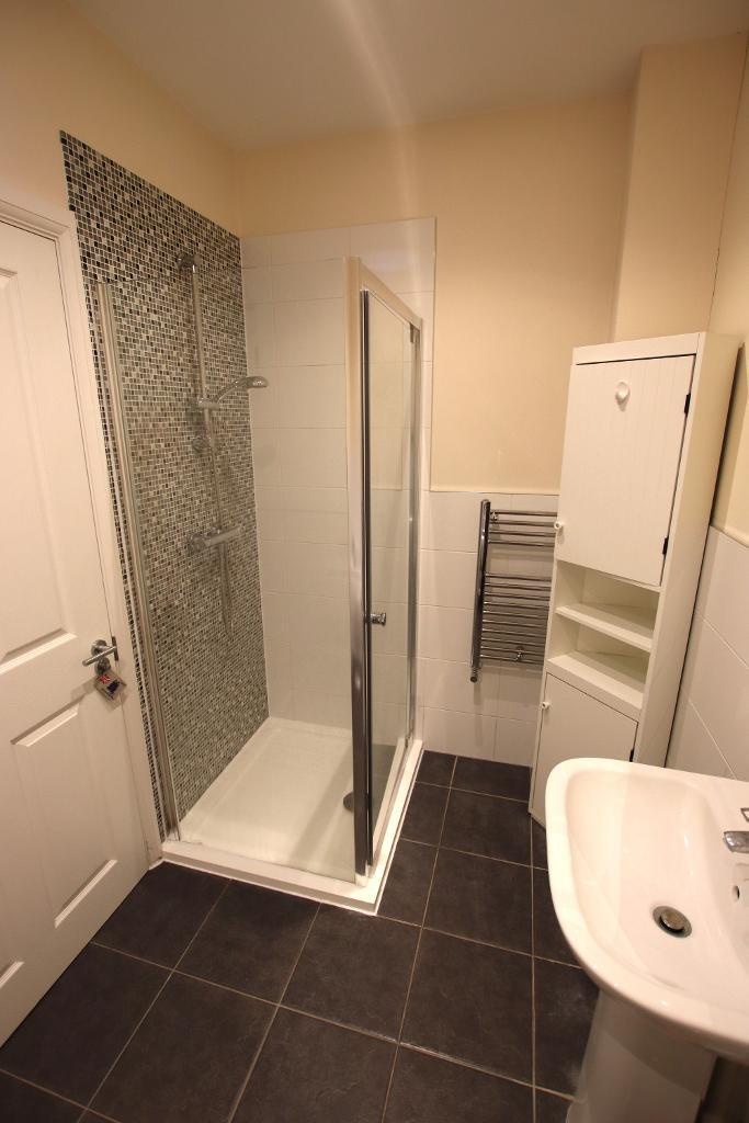 10' 8'' x 5' 5'' (3.27m x 1.67m) 4 piece suite comprising low level w/c, wash hand basin, panel enclosed bath, shower cubicle with built in shower, ceramic tiled floor and splash backs, flat plastered ceiling with spot lights, heated towel rail.