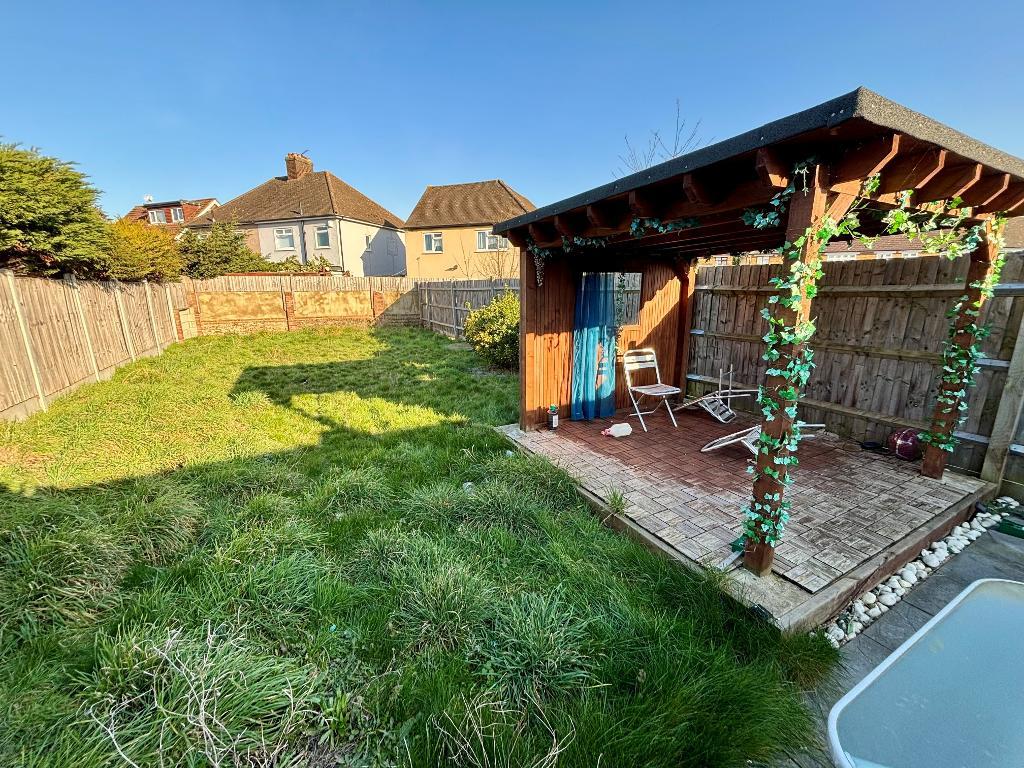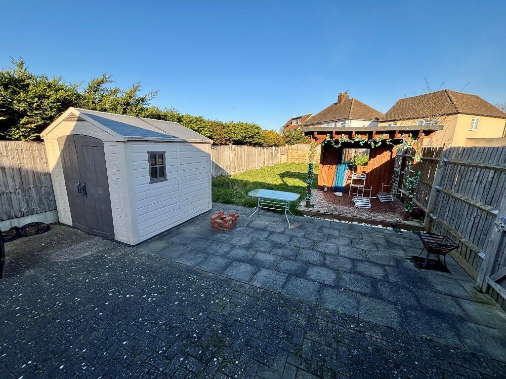 Approx. 70 ft commencing with block paved patio which extends to side patio and side access path, rest is lawn with covered sitting area and a shed.