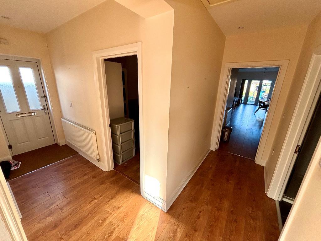 Laminate flooring, flat plastered walls and ceiling with spot lights, radiator, loft hatch, doors to