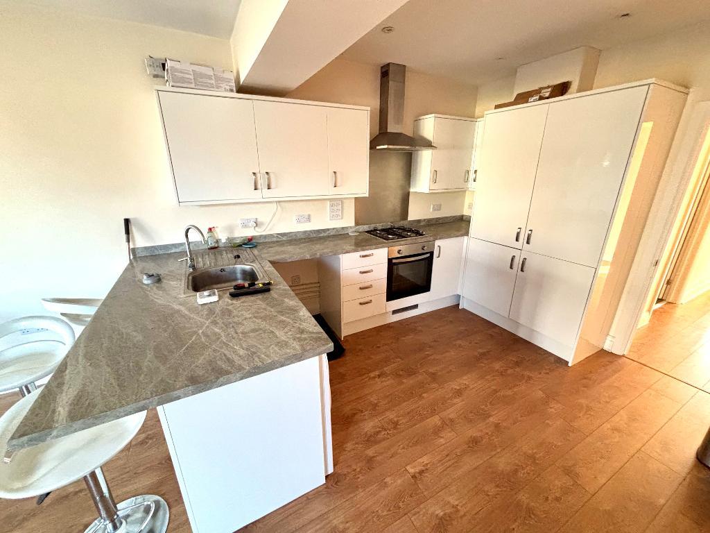 Kitchen Area - Eye and base units, marble effect work tops, space and plumbing for washing machine, fridge freezer, electric oven and gas hob, radiator, laminate floor, flat plastered walls and ceiling.
